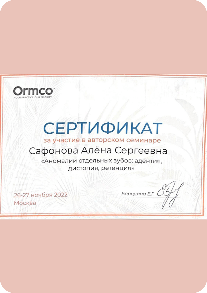 Приняла участие в семинаре «Аномалии отдельных зубов: адентия, дистопия, ретенция», г. Москва