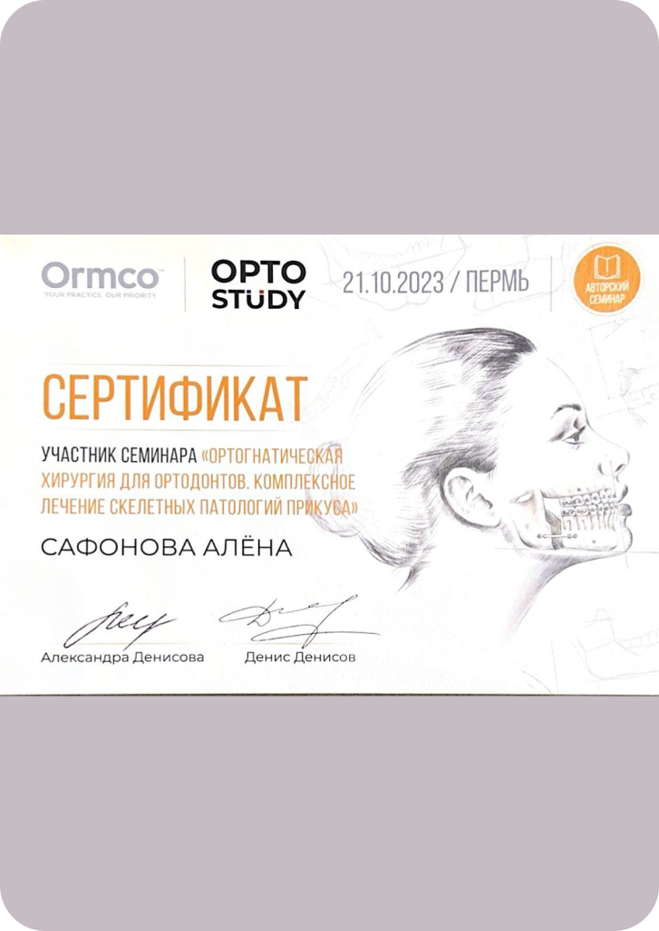 Приняла участие в теоретико-практическом курсе «Ортогнатическая хирургия для ортодонтов. Комплексное лечение скелетных патологий прикуса», г. Пермь