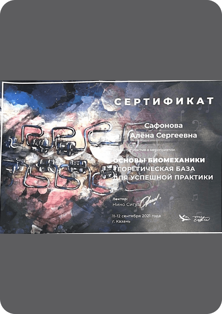 Приняла участие в теоретико-практическом курсе «Основы биомеханики. Теоретическая база для успешной практики», г. Казань
