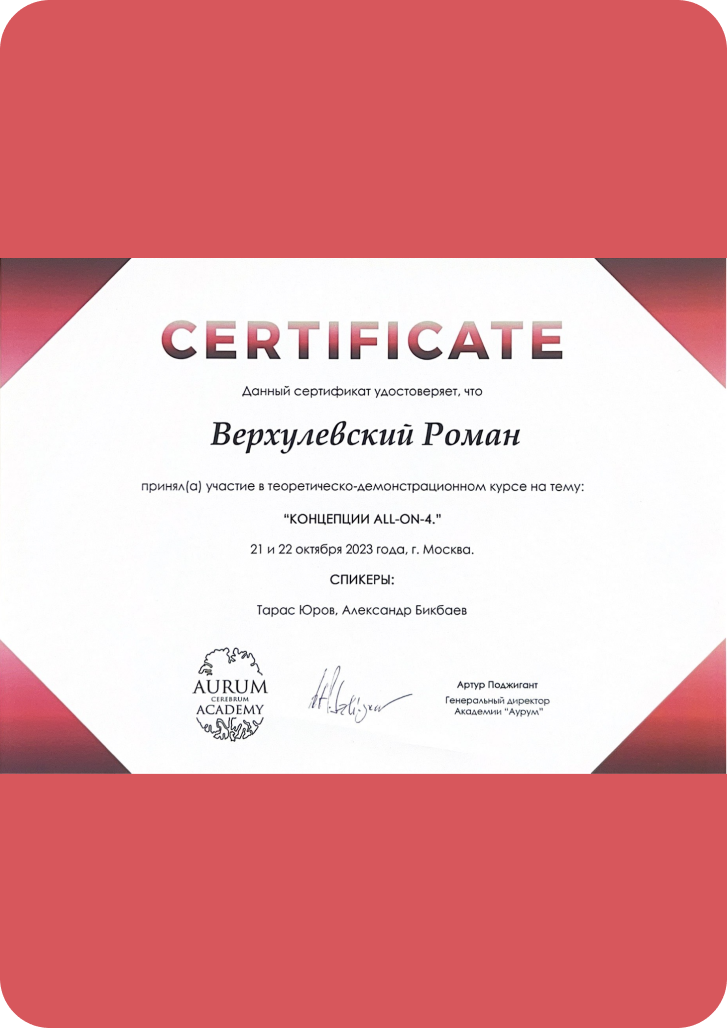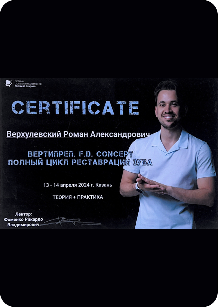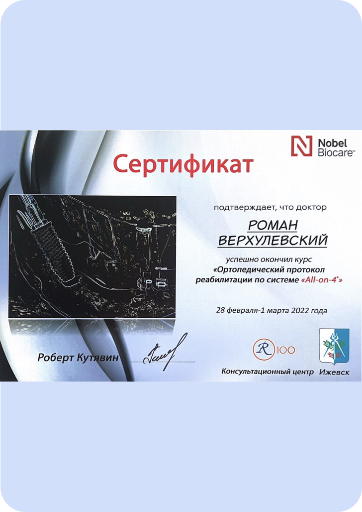 Прошел теоретическую и практическую часть курса «Протезирование на дентальных имплантах», А. И. Поляков, г. Казань
