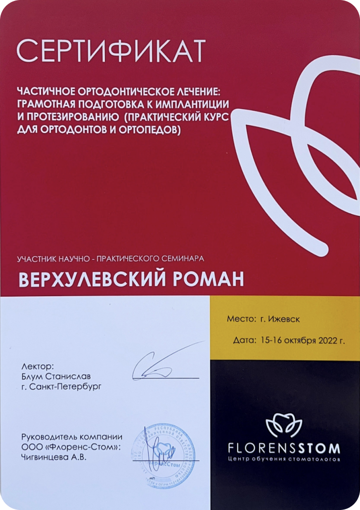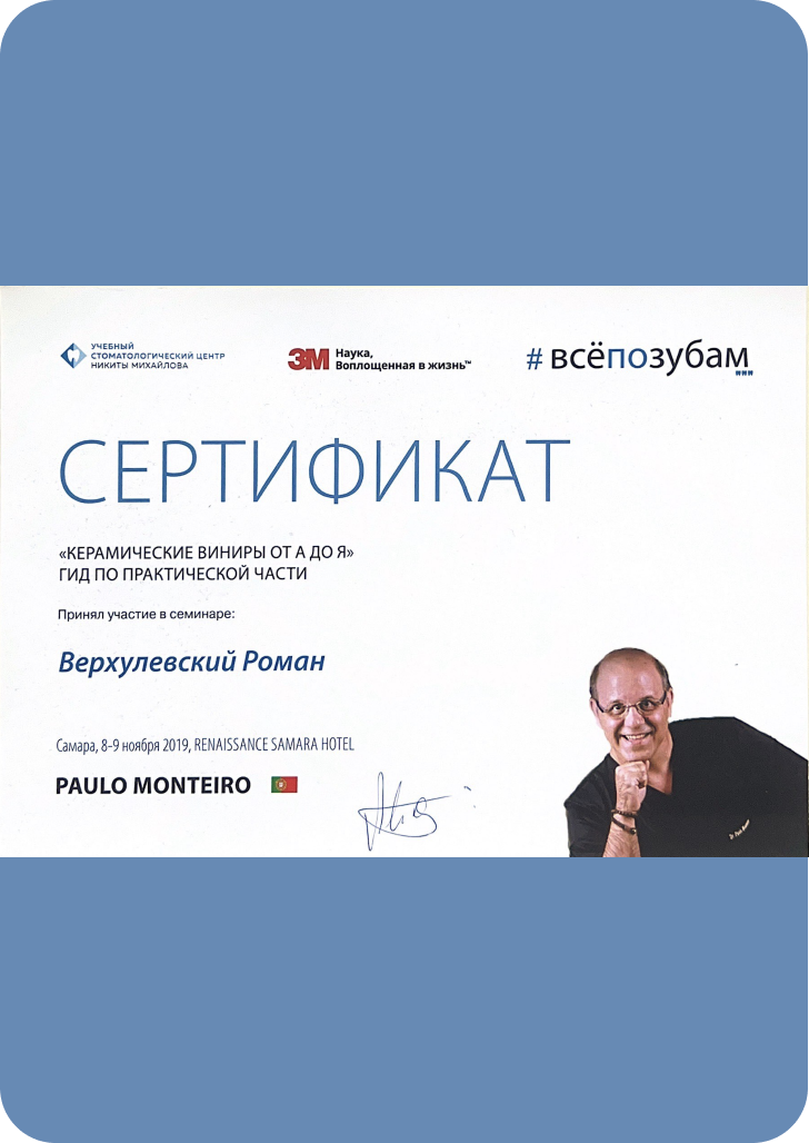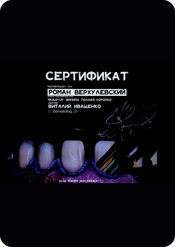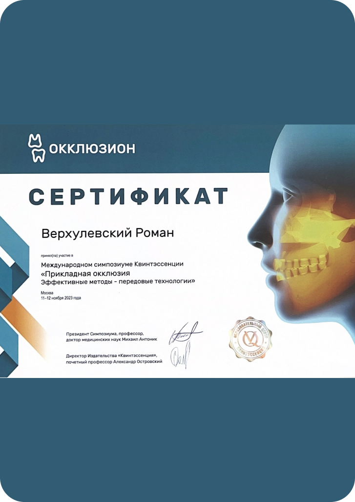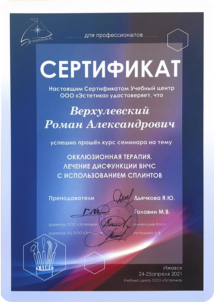 Принял участие в теоретико-практическом курсе «Восстановление артикуляции зубных рядов на приёме врача-стоматолога (терапевта, ортопеда, ортодонта)», Е. А. Булычева, г. Чебоксары